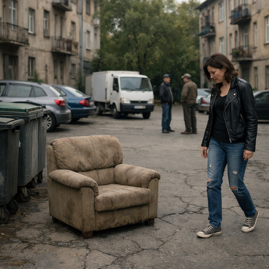 Коли Ема вийшла у двір, він був тихий і сірий, ніби хтось стер із нього кольори. Біля контейнерів лежали старий диванчик і кілька сміттєвих мішків, а вітер перегортав мокре листя, як сторінки без тексту. Вона вже хотіла просто кинути пакет і піти назад, аж раптом почула коротке рипіння гальм: до майданчика підкотив невеликий фургон. Двоє чоловіків вискочили швидко й злагоджено, наче робили це не вперше. Не говорили голосно, не сміялися, не озиралися — просто зняли з кузова потерте крісло й поставили біля баків. За хвилину вони вже поїхали, лишивши після себе лише запах вихлопу й відчуття чужої поспішності.Ема підійшла ближче, насторожено, але цікаво. Крісло було не нове: тканина затерта, один підлокітник наддертий, шви місцями розійшлися. Та каркас виглядав міцним, форма трималася, нічого не хиталося. У голові одразу склалася проста картинка: перетягнути оббивку — і вийде зручне крісло для читання або для гостей. Їхній дім не був дизайнерським, зате був теплим і живим, а Ема любила речі, які можна «врятувати» руками. «Дивно, навіщо викидати таке?» — подумала вона. — «Трохи праці, і стане як нове».