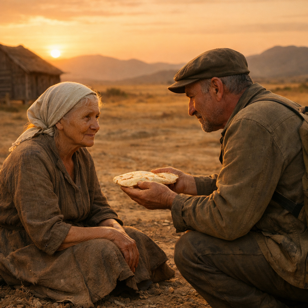 Люсія зайшла в хату, відкрила полотняний згорток і побачила два коржики, що лишилися. Вона знала, що один із них — її вечеря, а другий — завтрашній день. Але вона також знала, що хлопець може не дійти до того «завтра». Вона взяла один коржик, вийшла надвір і простягнула йому. «На, сину. Не багато, але це все, що маю». Хлопець глянув на коржик і на її дірявий дах, на сухий двір, на потріскану землю. «Я не можу… вам же теж треба», — прошепотів. Люсія похитала головою: «Тобі треба більше. Бери. Не сперечайся». Він узяв коржик так обережно, ніби це була коштовність, і сльози потекли по брудних щоках. «Ви не уявляєте, що це для мене», — сказав він. «Уявляю, — відповіла Люсія. — Я якраз дуже уявляю».Хлопець їв повільно, дякував кожним ковтком, а потім підвівся, перекинув торбу через плече й сказав: «Бог вам віддячить. Я не забуду». Люсія лише махнула рукою, ніби відганяла зайві слова: «Іди, сину. Бережися спеки». Вона проводжала його поглядом, доки він не зник за вигином стежки. Потім зайшла в хату й побачила останній коржик на столі. У кімнаті стало так тихо, що вона чула власне дихання. «Ну що ж, Господи, — промовила вона вголос, — якщо Ти хотів перевірити мене, то вже перевірив. Я віддала все, що мала. А тепер — Твоя черга вирішувати, що буде зі мною». Вона сіла на старий килимок, заплющила очі й відчула дивну, незрозумілу легкість — ніби тягар упав із плечей, хоч їжі не побільшало.